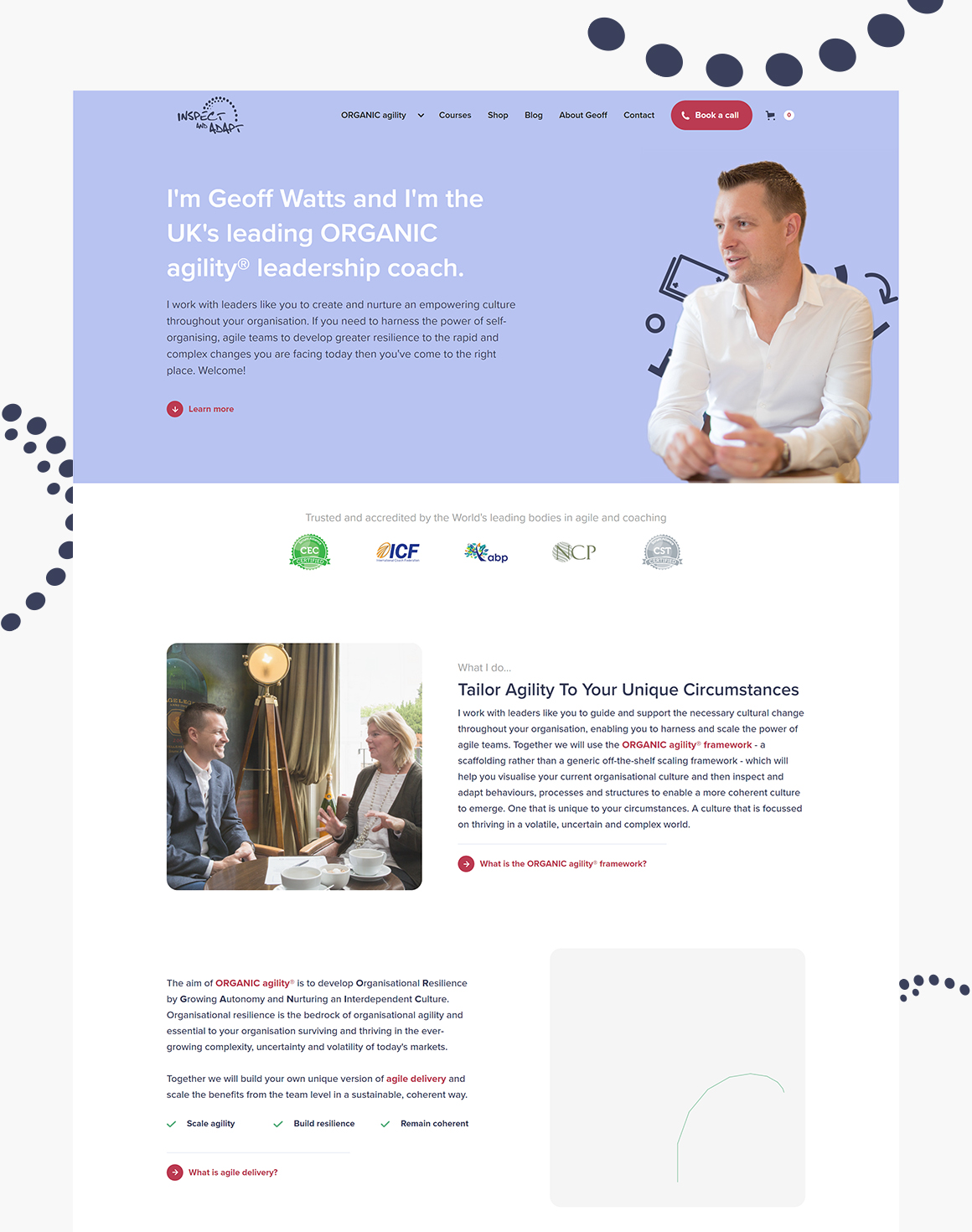 Offering a multitude of services (coaching, courses, and coaching cards to name a few), Geoff requires on-going design and development services that showcase his range of products and services.